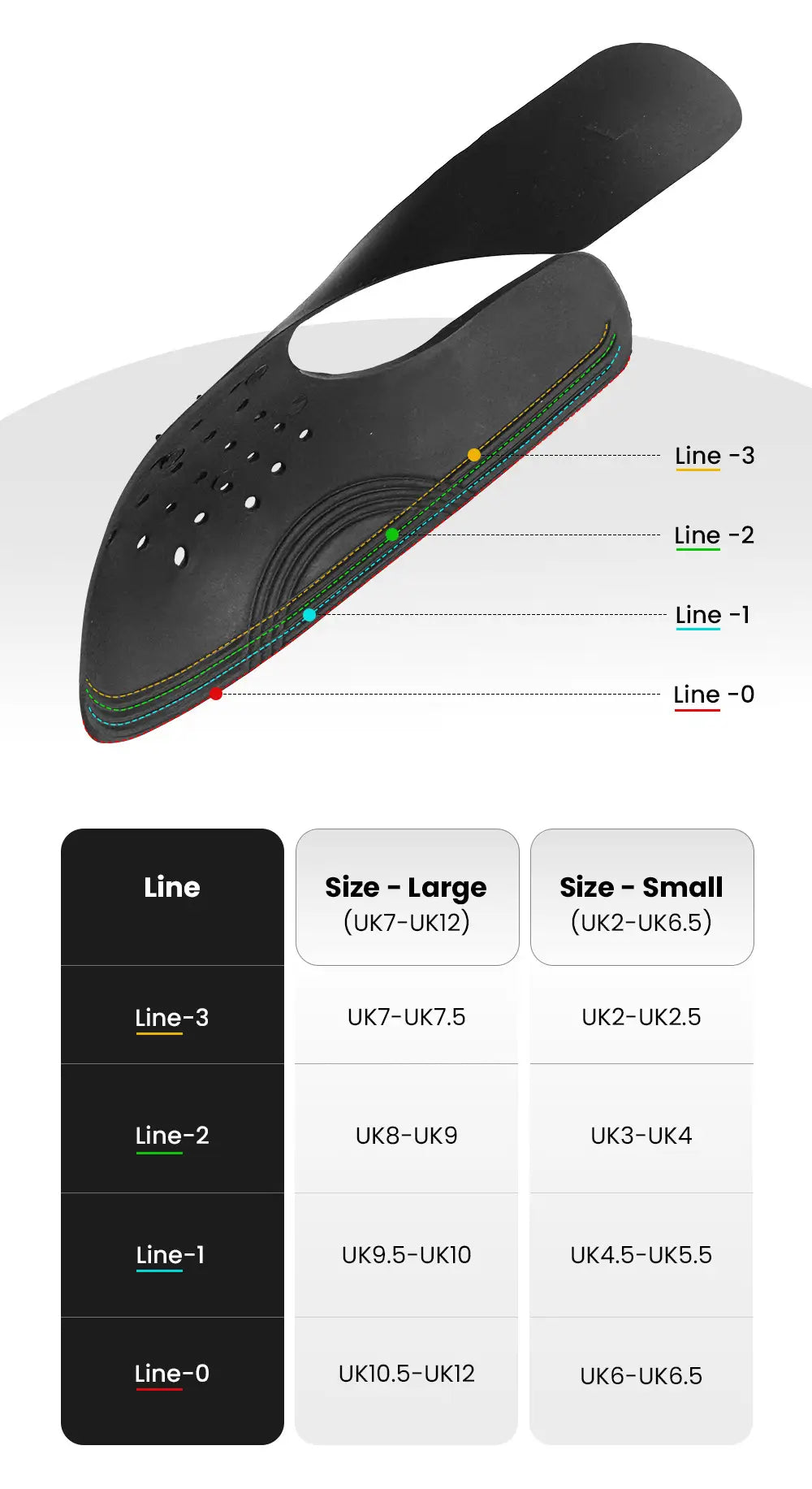 This size guide serves as a reference, but every shoe and foot is unique. Trim and adjust the Crease Defender for a customized, comfortable fit.